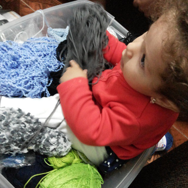 Na foto abaixo a Bibizinha, a nossa Tricofilha, já brincando com os fios e suas texturas diferentes.